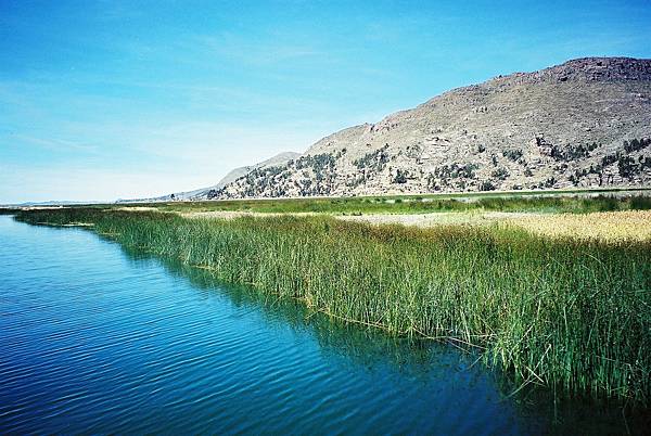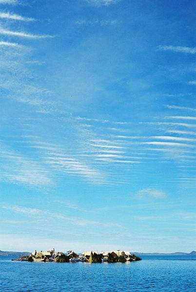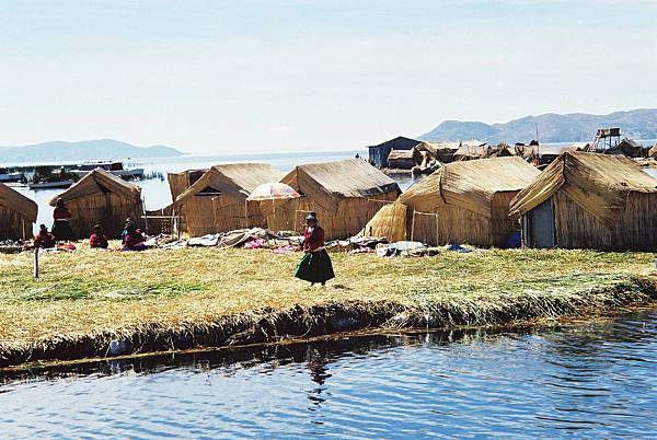 從普諾乘遊艇約半小時後便見到神奇的蘆葦島,我們參觀了當中最大型的一個,浮臺的直徑約為25米,容納了幾所簡陋草屋和一間‘學校’。 登上小島像是踏上了一塊浸泡在水中的巨型海綿似的,感覺頗爲懸浮不實,原來浮臺的地面比水面只是高出少許,而蘆葦草織則如鳥巢般疏通多孔, 只要用力一踩已可觸及冰冷的湖水,由於水草會隨時日逐漸腐萎,所以烏洛人必須經常不斷為小島堆織上新層蘆葦才能維持家園不致淹沒下沉!!