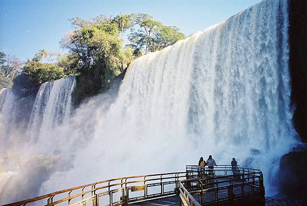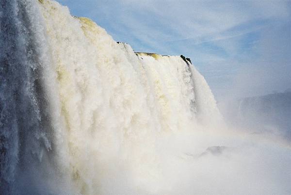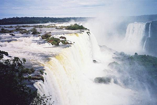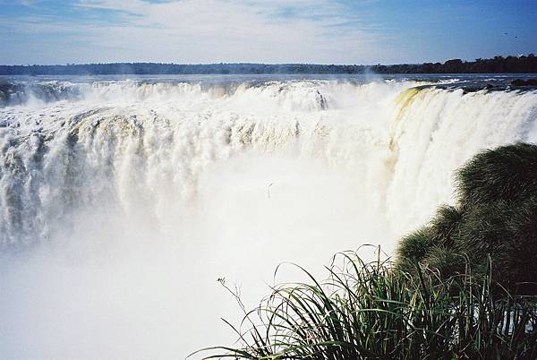 位於東西河岸轉折處的魔鬼之喉(Devil's Throat)是伊瓜蘇最沸騰震撼的核心部位,瀑布峽崖呈馬蹄形狀,洶湧潮水自三方匯合傾瀉投落,在半空中與谷底反濺的萬丈水霧混戰交融,咆哮水聲如雷貫耳,四周霧飛煙騰白茫一片,只容一彎完美彩虹安坐其中。